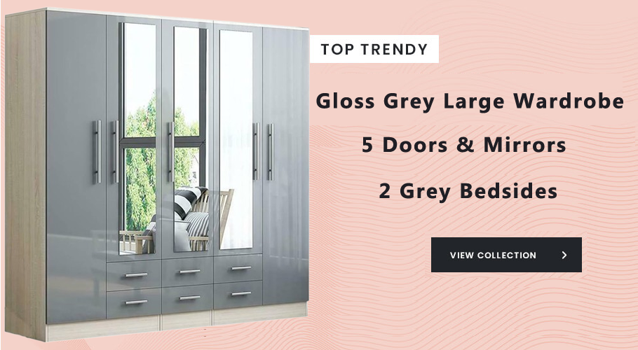 High Gloss Grey Large Wardrobe 5 Door 6 Drawers