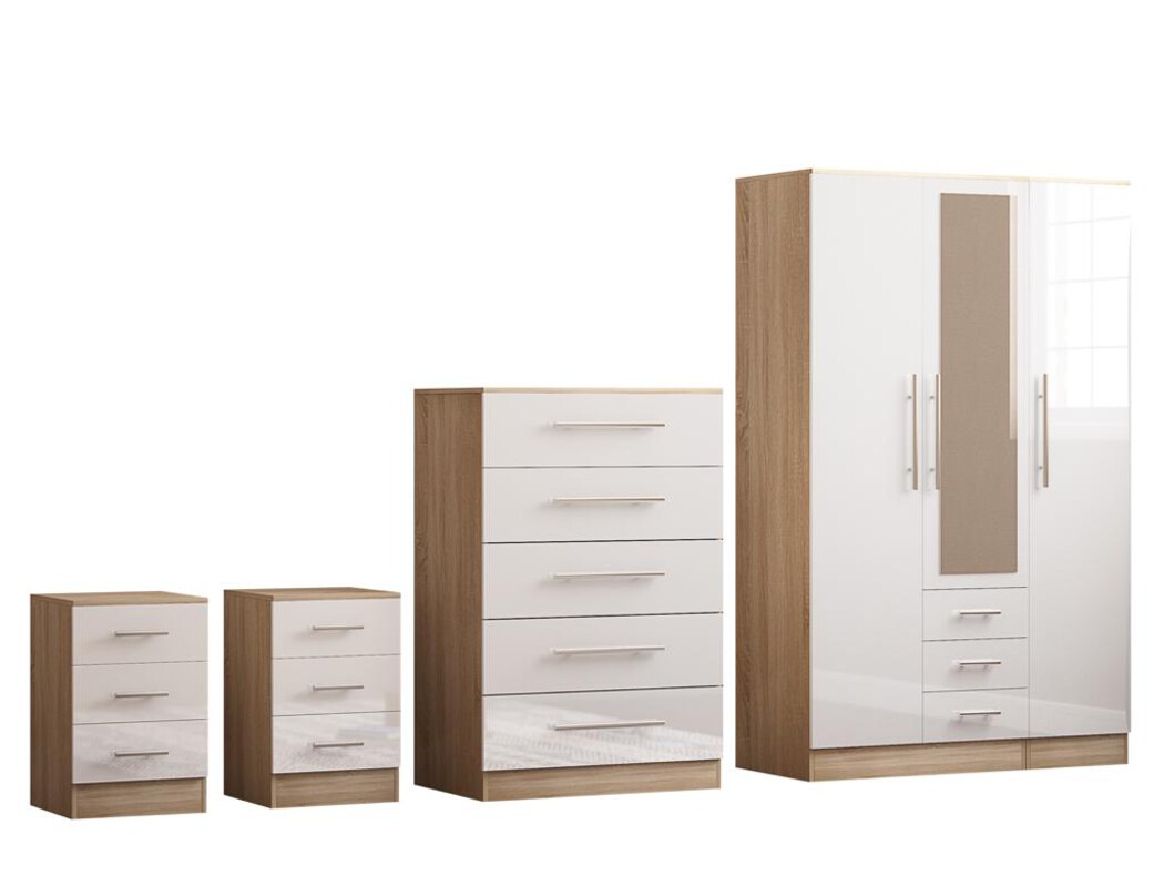 and cohesive modern styling. This complete 3-piece furniture bundle includes a spacious combi wardrobe, a multi-drawer chest, and a matching bedside table — perfect for creating a clean, coordinated bedroom layout.