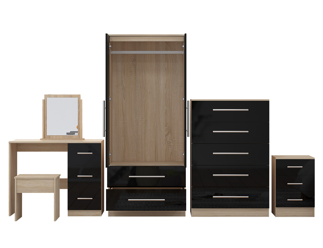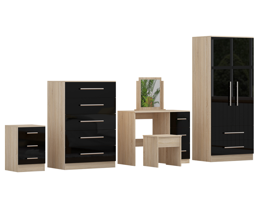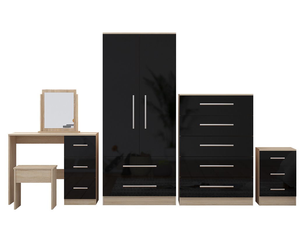 High Gloss Quattro Bedroom Black Set Wardrobe, Chest, Bedside, Dressing Table