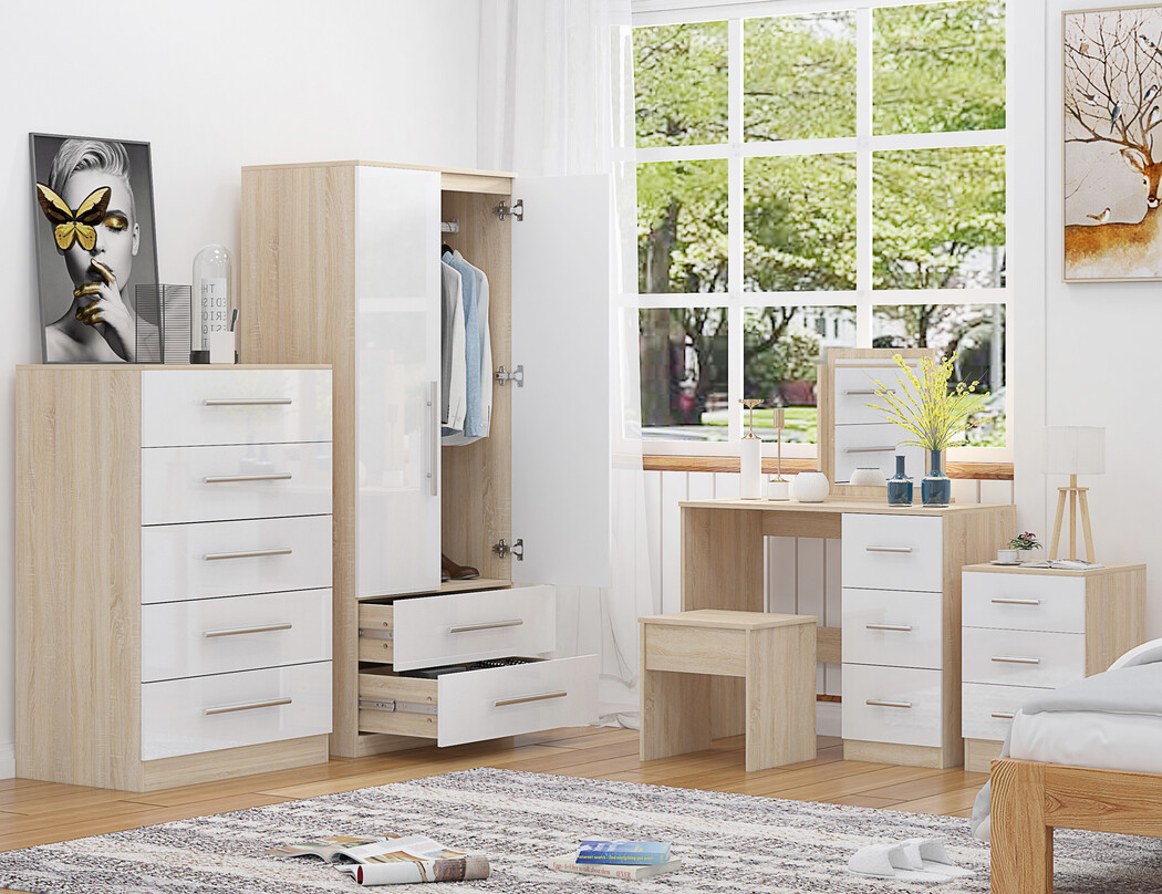 A Quattro threat set of stylish products from the Unique Furniture line, including our 2 Door High Gloss Fitment Wardrobe, a matching High Gloss Chester draweR,a High Gloss Bedside Tables and a dressing table. Very easy to assemble with clear instructions. Made from high quality Chipboard Wood and High Gloss.