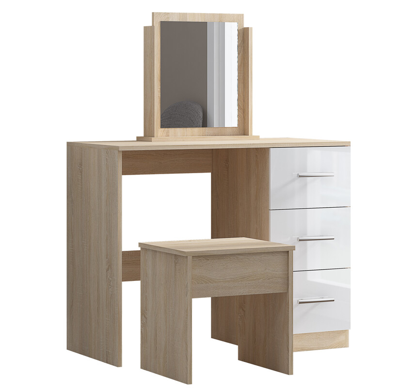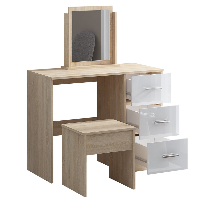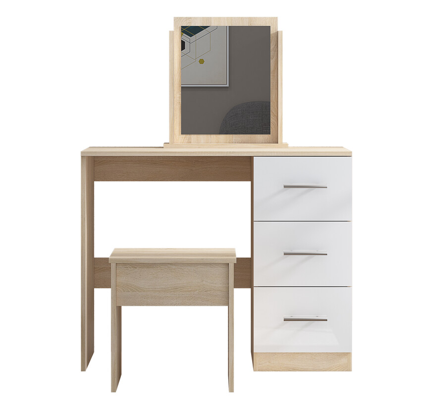 - Features : 3 Roller Drawers, a mirror, and a stool